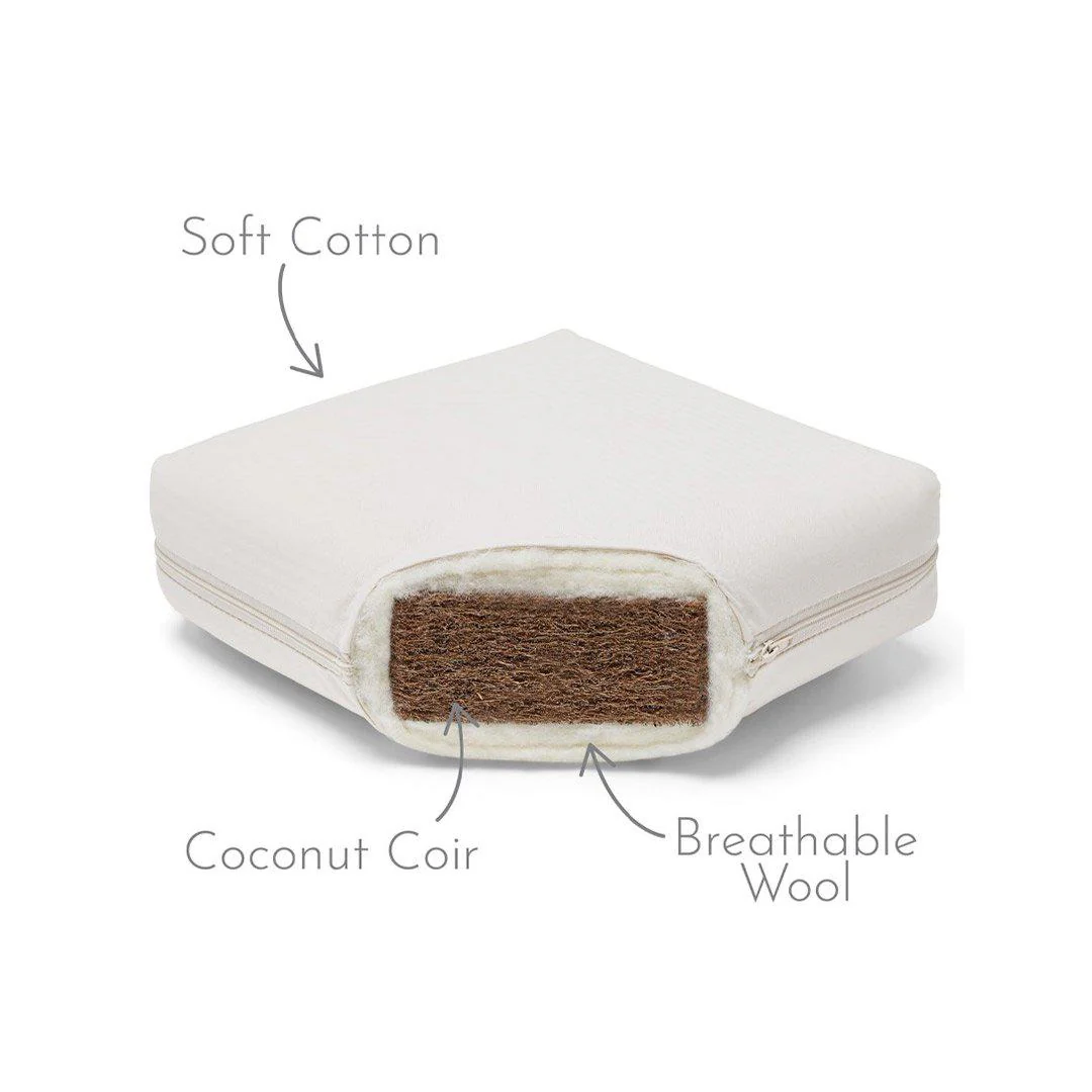 The mattress core is created from coconut fibres blended together with natural latex to act as thousands of tiny springs, providing your baby with the firm support recommended by safe sleep experts, whilst reducing individual pressure points and the risk of dipping.